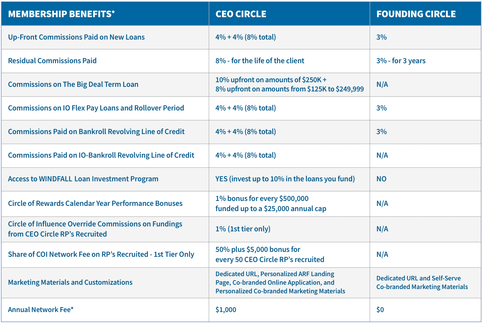 **To qualify, regular Amortizing Term Loans, Flex Pay Loans and Revolving Lines of Credit must have repayment terms of 39 weeks or longer. Elevated upfront commissions on The Big Deal Term Loan are for new clients only (out of the program at least 120 days) and is available for a limited time. Contact your loan consultant for full details. To retain the Circle of Rewards benefits detailed above, CEO member must maintain an active membership which requires payment of an annual membership fee.